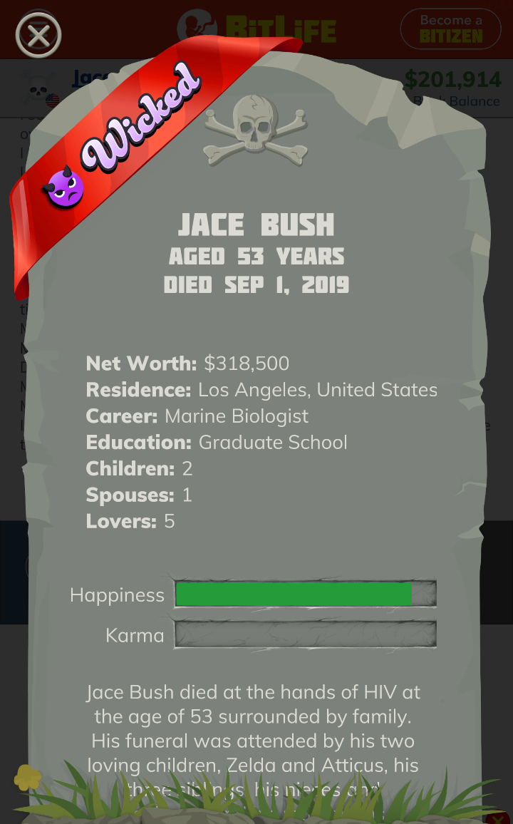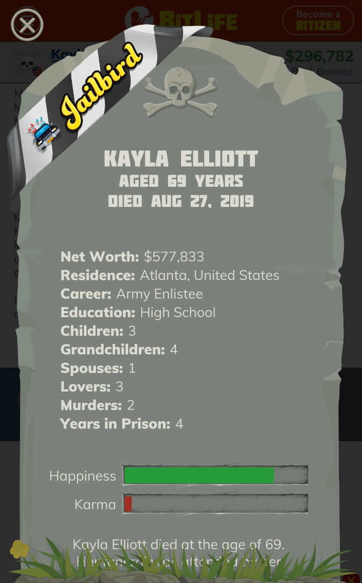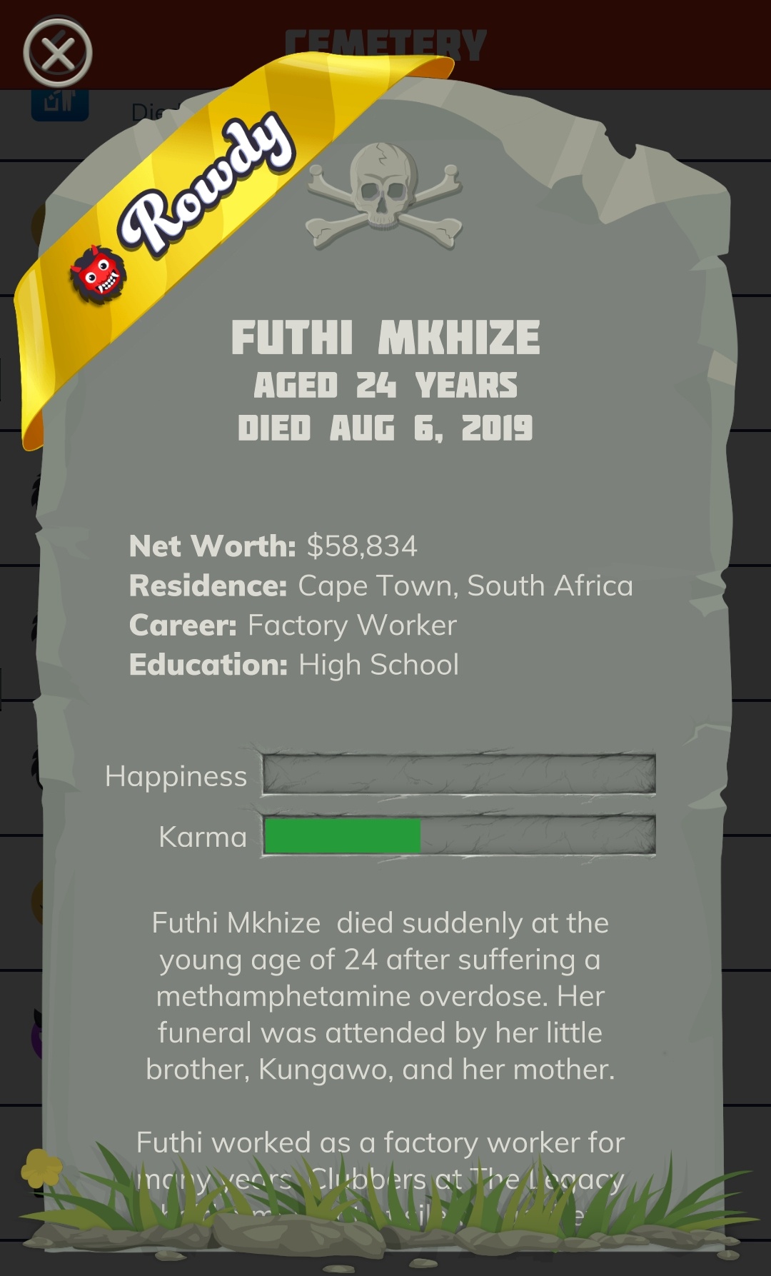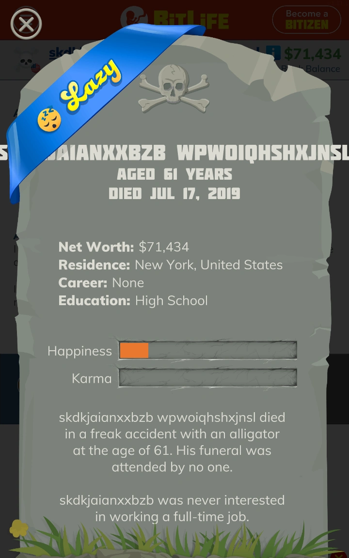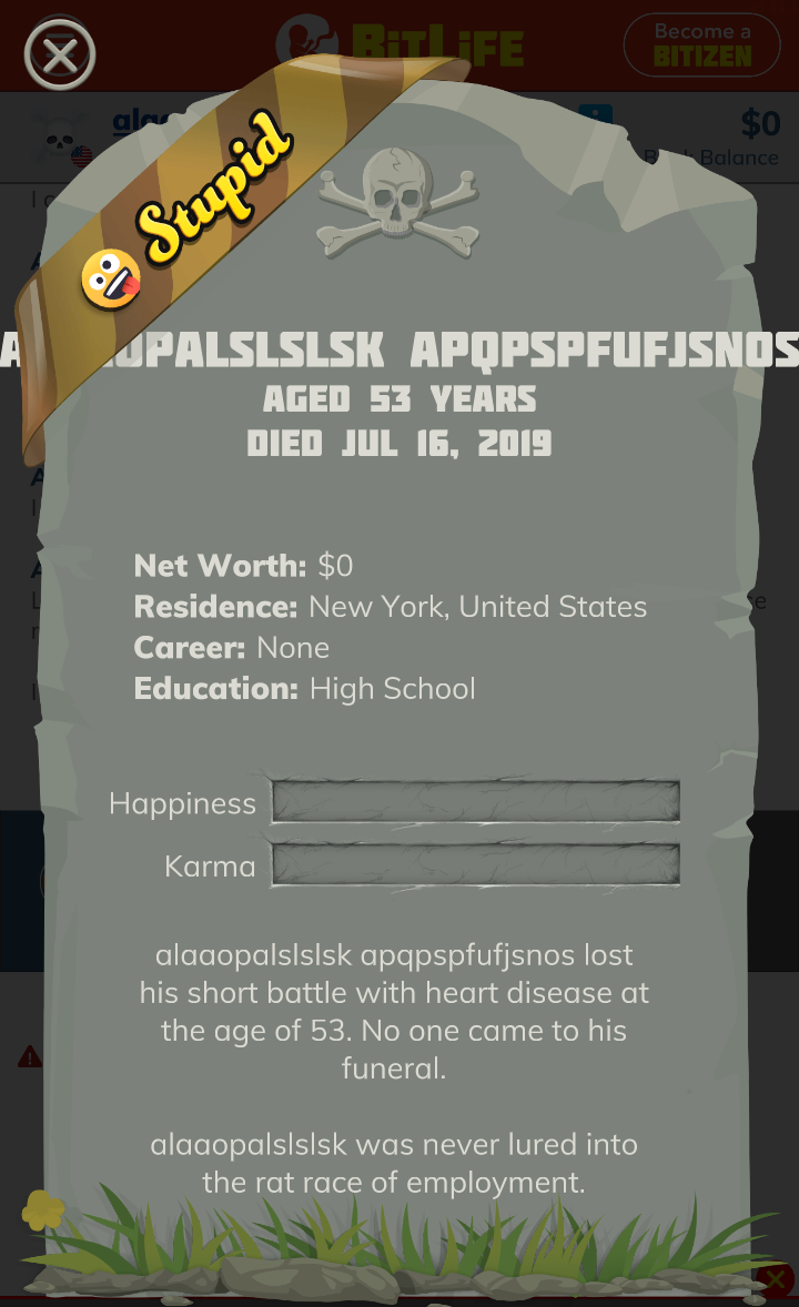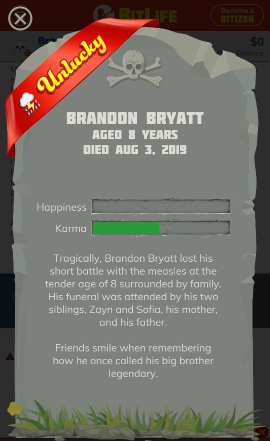 Notes: Even if you live past zero, you can still get it if you surrender and don't do anything prominent in your life. The ribbon can also be achieved by dying with negative net worth if the average of your smarts and looks is over 50%. Dying by prison execution at a young age while doing nothing significant in the life other than committing the crime that gave your character the execution will also give them this ribbon.