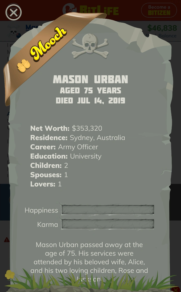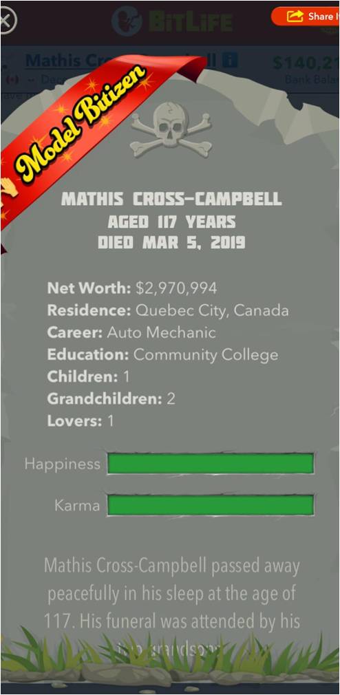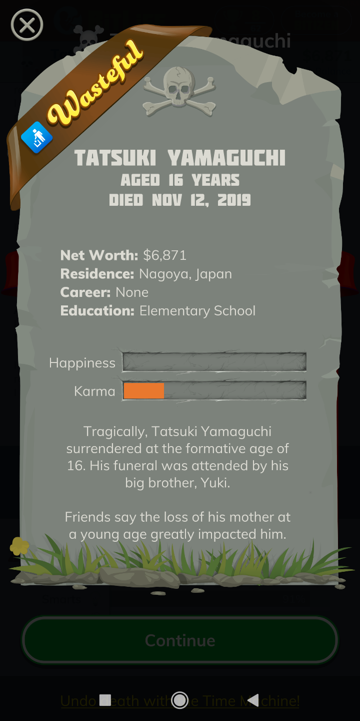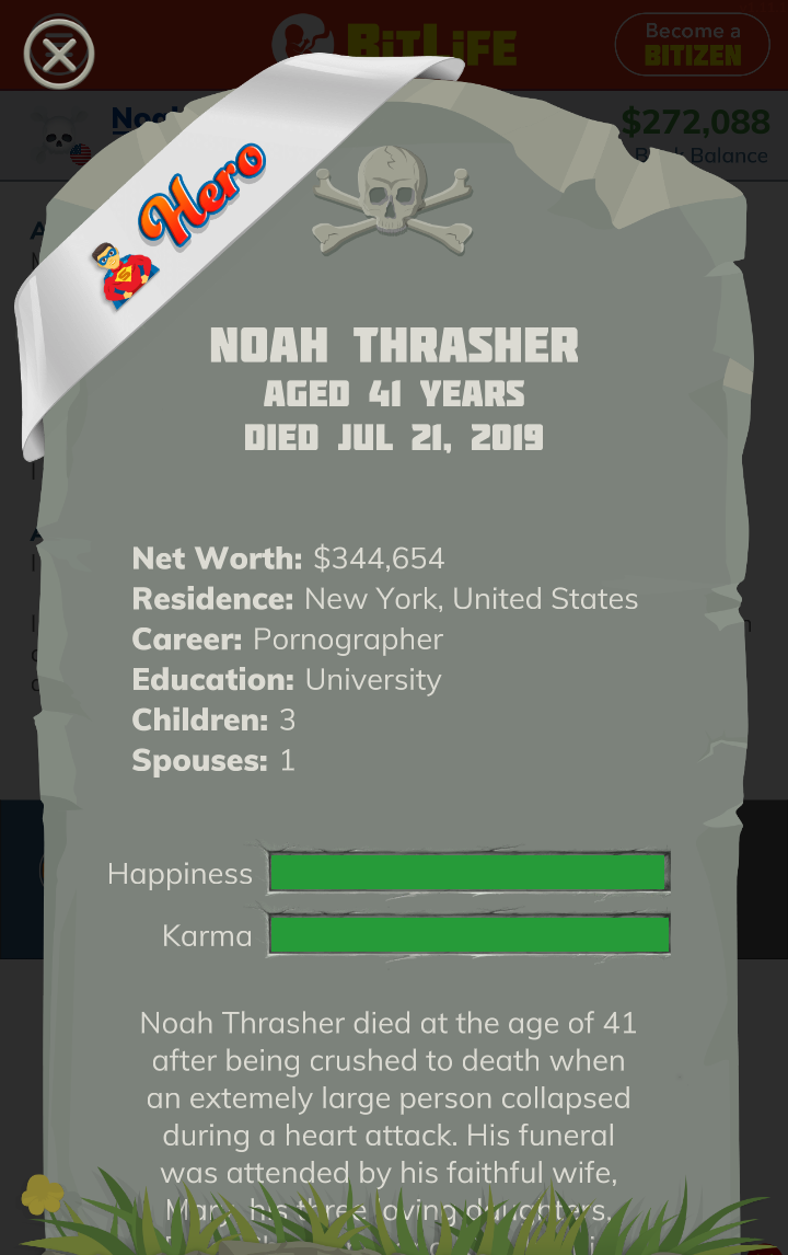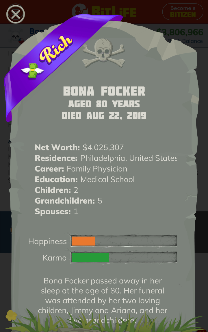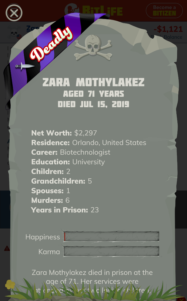 Notes: Even if you live past zero, you can still get it if you surrender and don't do anything prominent in your life. The ribbon can also be achieved by dying with negative net worth if the average of your smarts and looks is over 50%. Dying by prison execution at a young age while doing nothing significant in the life other than committing the crime that gave your character the execution will also give them this ribbon.