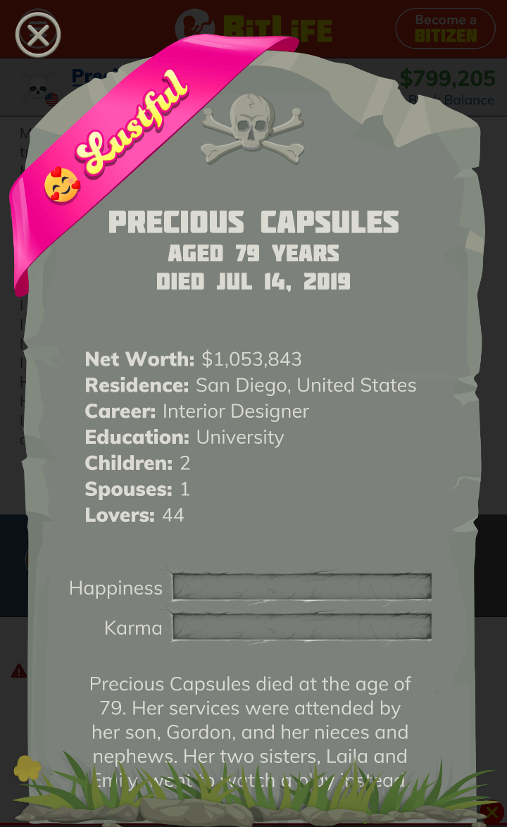 Notes: You do not need to have Bitizenship to get this ribbon. Don't try to rescue anyone to avoid getting the "Hero" ribbon. Don't have over 8 or 5 biological children with 5 grandchildren to avoid getting the Fertile ribbon. Don't make over $20 million of net worth to avoid getting the Loaded ribbon.