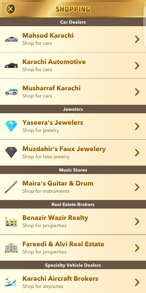 Asset Shopping includes Shopping for Real Estate, Cars, Planes, Instruments, Boats, and Jewelry. Keep in mind that Heirlooms, as though a part of assets, can not be shopped. For iOS players, there is a tab for Shopping in the Activities section where you can buy Assets, but you can also shop for assets through the Assets section. You can see the stats before buying. Asset dealers are divided into 5 sections: