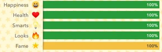 Stats are the four bars below your character that determine their well-being. They are randomised at the start, however happiness can be low in new generations due to the fact that the character has just lost their parent/lover. It is natural for stats to raise and lower a few points when aging up. Having higher percentages on the bars will make a character live longer and more successfully. Following the Fame update, if your character becomes famous, there is a fifth bar for Fame. Following the Politics update, there was another bar for Approval. In May 2019, Boosts were added to help characters with low stats be able to raise their bar. Players would have to watch an ad to get the boost if they are not a Bitizen. If a stat is at a low percentage (below 15%), it will show a warning sign that indicates that it is in jeopardy.